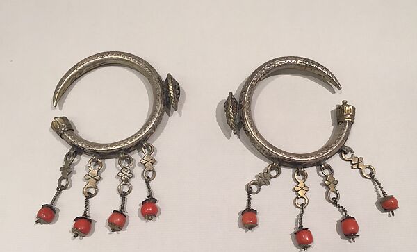 These Berber ear ornaments may have been inserted into the ear or attached to a diadem with chains, and positioned so as to hang on each side of the face, near the ear. This style is known as tikhrazin and is popular in the Rif mountain region. Coral is a typical material for Berber jewelry and is thought to possess baraka, or blessing.