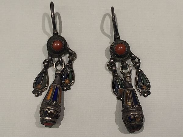 These earrings known as "tegoudmatine" are ornamented on the recto and verso with brightly colored enamels that are typical of the Kabylie region in Algeria. Enameling techniques in North African Berber jewelry are believed to have been brought by jewelers exiled from Muslim Spain after the fifteenth century Reconquista. While coral was a much-valued gemstone in Berber culture, plastic imitation is often found in jewelry from the twentieth century.