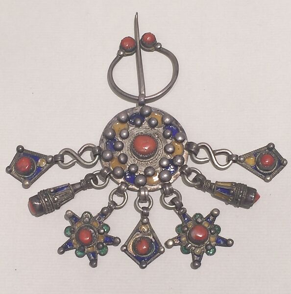 This fibula is ornamented with brightly colored enamels that are typical of the Kabylie region in Algeria. The central round element is a repurposed 19th century French Franc, which is identifiable from the verso, but has been completely covered over with enamel and large silver granulation on the recto. The pin at the top of the object indicates it would have been used to keep a cloth garment in place, but the circular shape with pendants is also known as "tabzimt" and is sometimes worn attached to a head scarf.