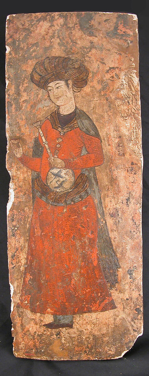 In the sixteenth and seventeenth centuries, mural paintings were commissioned by Safavid rulers and grandees for their palaces. The most beautiful youths in the court were chosen for the office of cupbearer and were a popular subject for artists, who portrayed them in idealized form. They appeared as shown here, in mural paintings, as well as in paintings intended for albums.