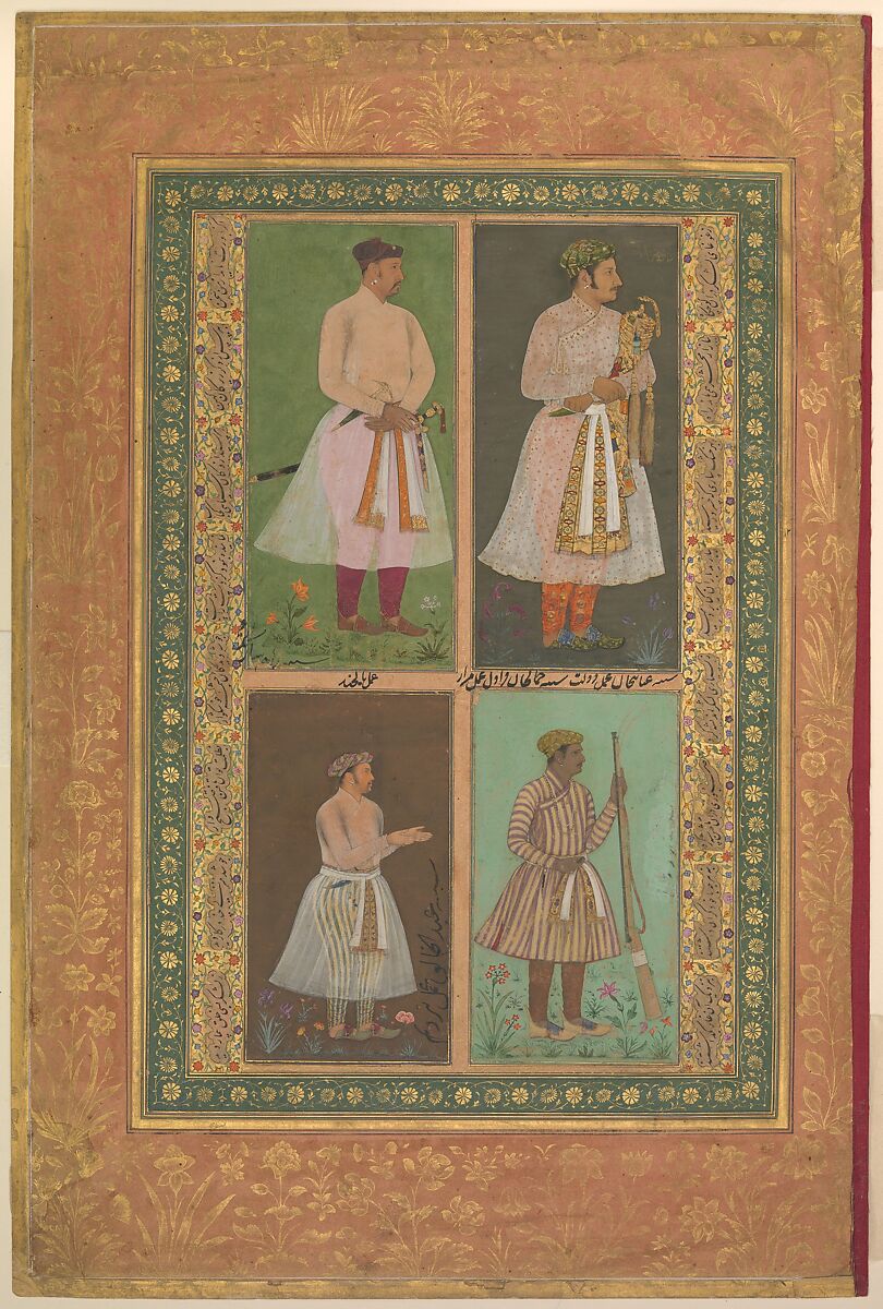 - Title: "Four Portraits: (upper left) A Raja (Perhaps Raja Sarang Rao), by Balchand; (upper right) 'Inayat Khan, by Daulat; (lower left) 'Abd al-Khaliq, probably by Balchand; (lower right) Jamal Khan Qaravul, by Murad", Folio from the Shah Jahan Album