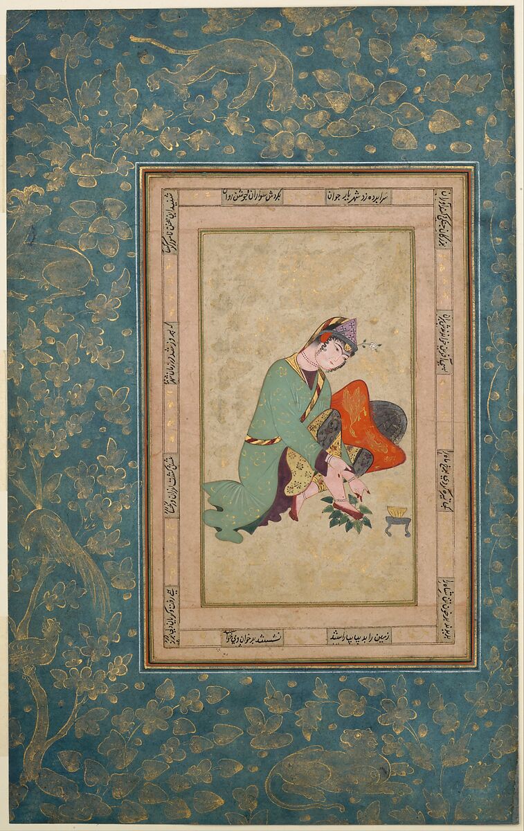 This painting is a rare depiction of a young woman applying henna to her feet, a ritual associated with rite of passage celebrations, specifically marriage, in Iran and surrounding regions. The subject chosen by this unknown artist reflects the increasing interest of Safavid painters of this period in depictions of everyday people and events. The sitter’s right foot rests on a pile of henna leaves, her garments falling back slightly to reveal her gold and gray undergarments. The illustration would have been included in an album of paintings and drawings.