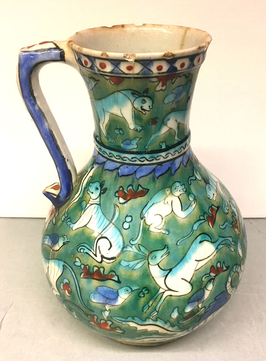 A collection of animals appears here, their motifs suggesting a relaxed, pastoral procession on the neck and a more energetic free-for-all on the body of the jug. It is difficult to assign symbolic meanings to groups of animals this varied, though the lion, for example, has a long history in Islamic and pre-Islamic art as both a royal and an astrological symbol. Quite as likely is the possibility that the Iznik potter was attracted to animal forms solely as decoration.