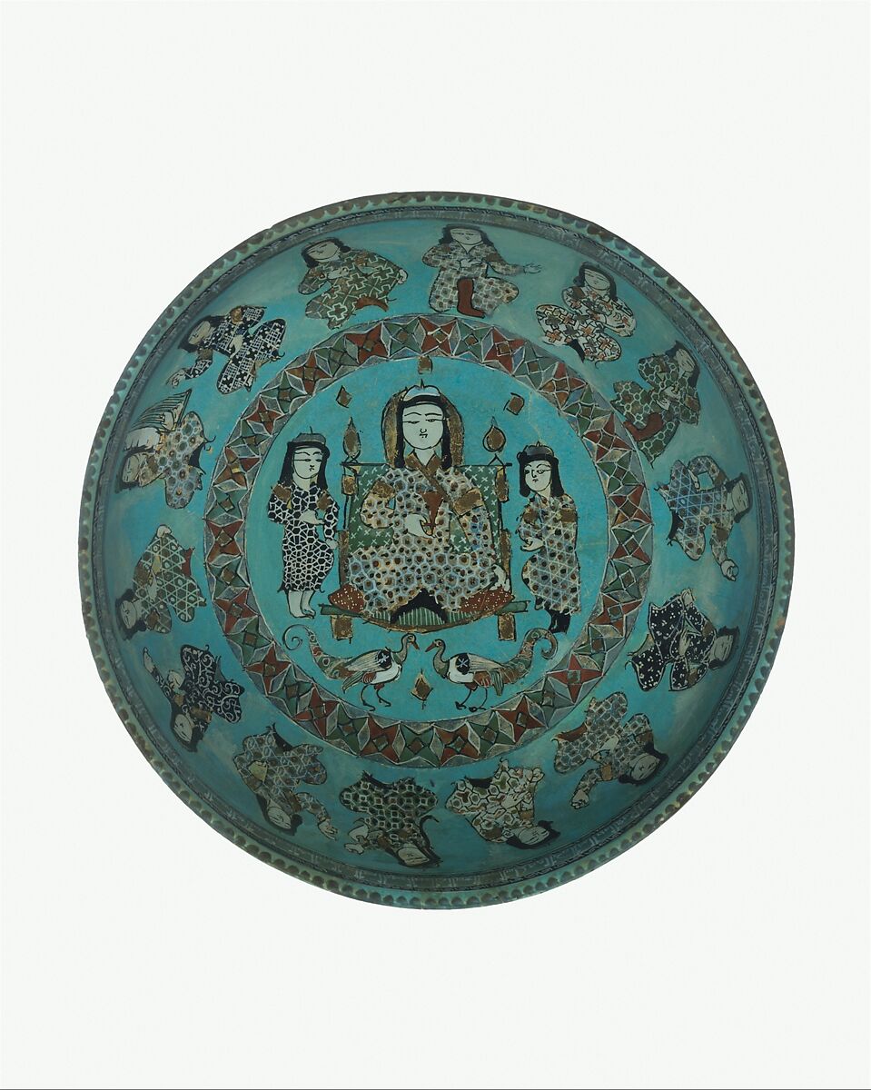 Like many of the other mina'i ceramics, this example is concerned with courtly themes—here, the seated royal figure, holding a wine cup, is flanked by attendants and surrounded by courtiers. The peacocks at his feet underscore this theme.