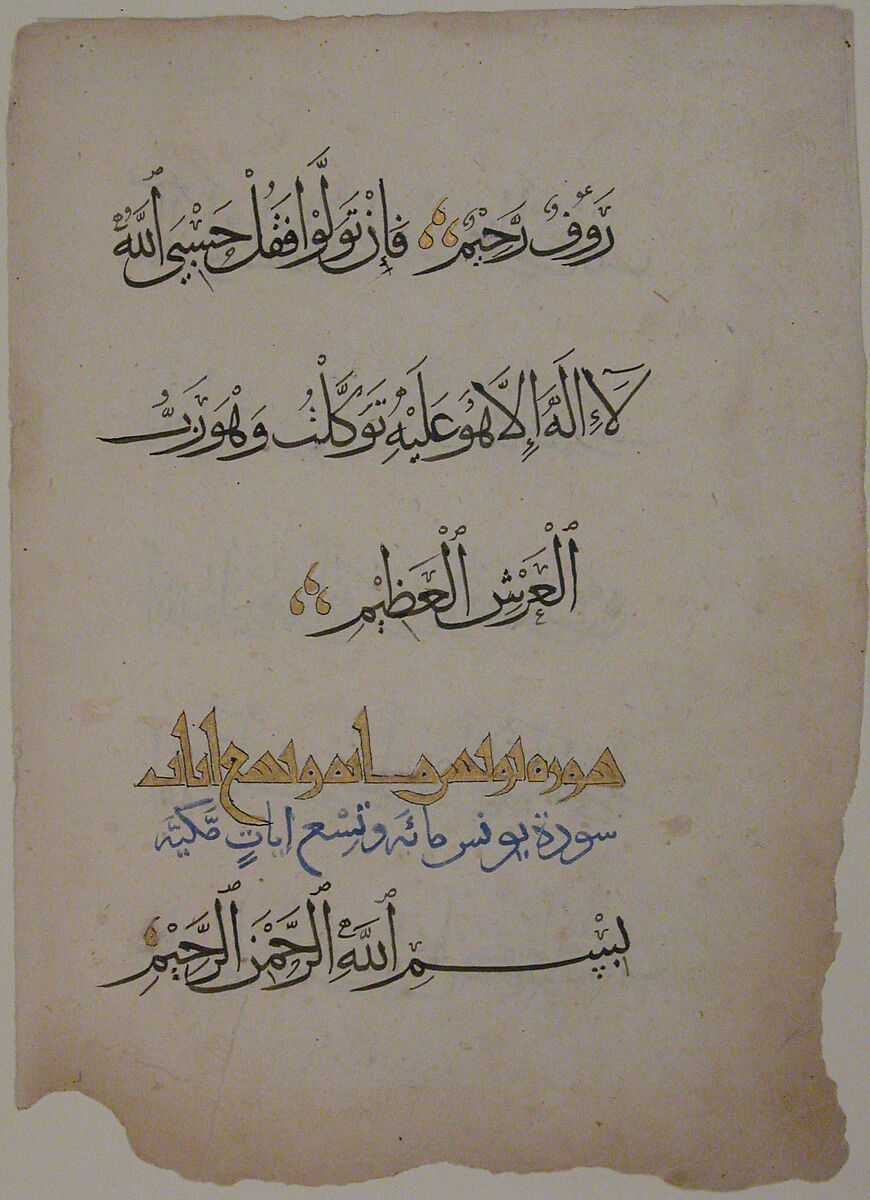 In this folio from a Qur’an manuscript, a kufic line in gold leaf indicates the heading of Sura 10 (Sura Yunus) and the number of verses (109), while verses are written with a black ink in naskhi script. The end of a verse is marked by three gold reversed commas.