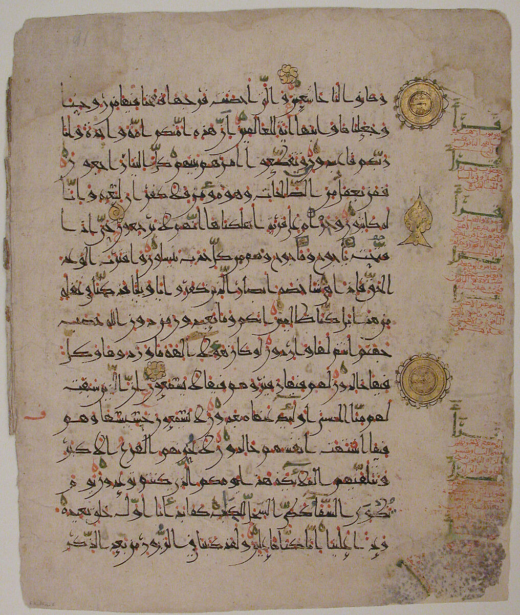 Qur'an leaf on paper. The rectangular broken cursive or new style script became popular for Qur'ans in the second half of the 10th century. In the margin are notes on the readers of the Qur'an.