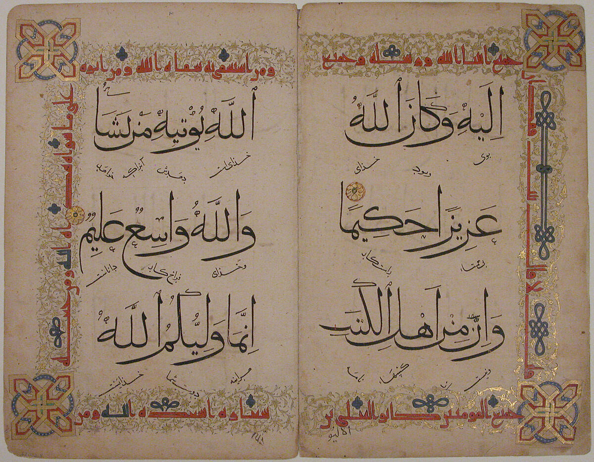 The double folio is from a Qur'an manuscript with three lines in black ink on each page and diagonally arranged interlinear translations in Persian. Kufic calligraphy in red and blue against a background of vegetal scrolls in gold surrounds the text, creating a border, and geometric floral motifs in red, green, blue and gold ornament the corners.