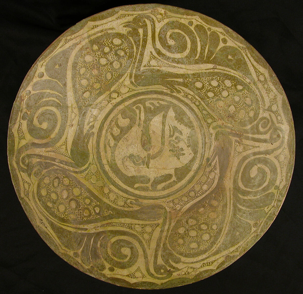 - Medium: Earthenware; white slip, slip decoration in green luster