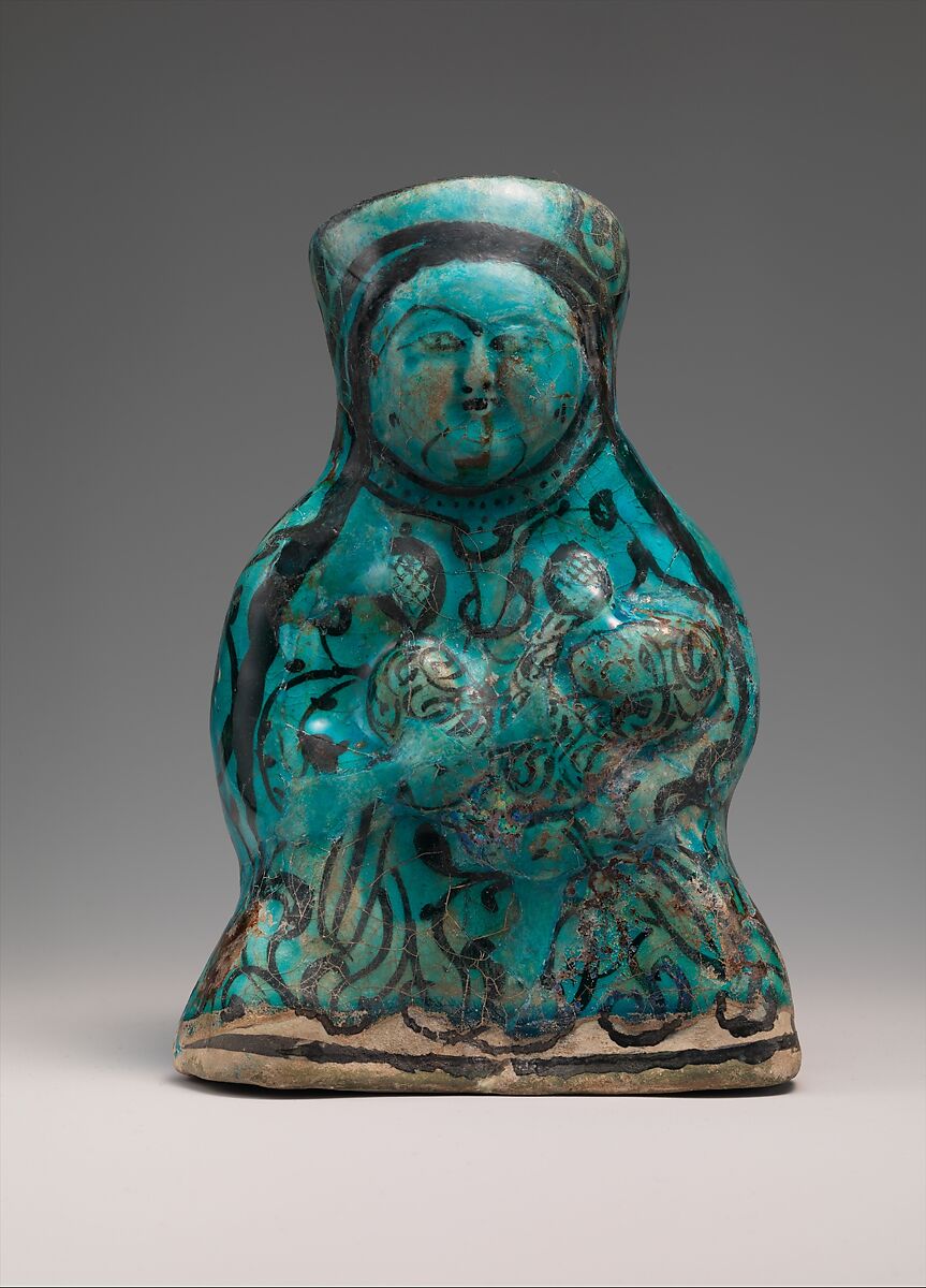 Its lower part was left devoid of the turquoise glaze probably to avoid sticking with other objects stacked in the kiln. One can see there the black pigment painted directly on the body. Despite it unrefined appearance, the painted decoration quite precisely defines the details of the figures, such as the woman’s headdress, braids, and cross-hatched breasts. The marks painted on her cheeks follow a Central Asian iconography and are probably related to apotropaic rituals. They might represent tattoos or scars really practiced by women, as charms or applied as a form of facial adornment.