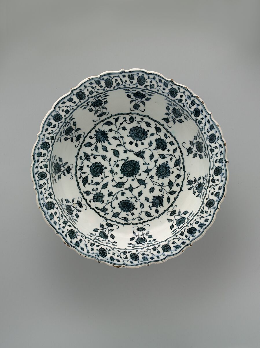 Many Ottoman sultans were avid collectors of Chinese porcelains, and the importation of these wares had a profound effect on regional ceramic production. The floral scrolls, foliate rim, and palette of this Iznik bowl reproduce those of a fifteenth-century Chinese prototype. The unusual addition of a raised foot on this piece, however, appears to be an Ottoman invention.