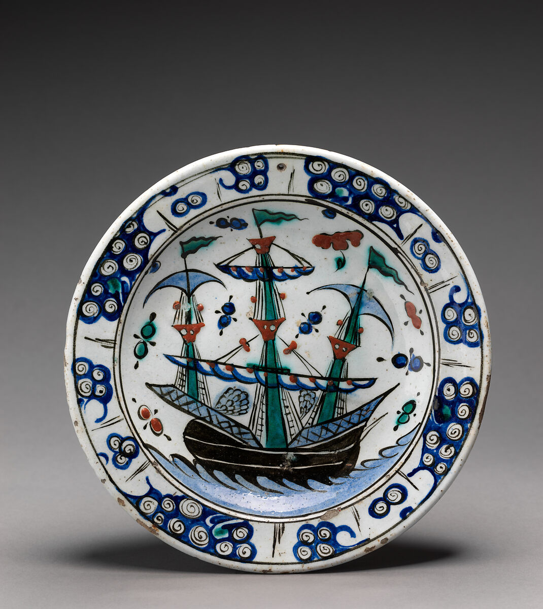 This dish comes from the major ceramics production center of Iznik, which rose to prominence in the sixteenth century and was known for its distinctive saz-style floral ornament. In the seventeenth century, there developed a new decorative repertory of figures, animals, ships, and buildings, including pagoda-like pavilions and domed churches. These field designs are found on numerous examples. The characteristic border of these pieces, ultimately derived from Chinese wave motifs, has become a pattern of alternating leaves and spirals.