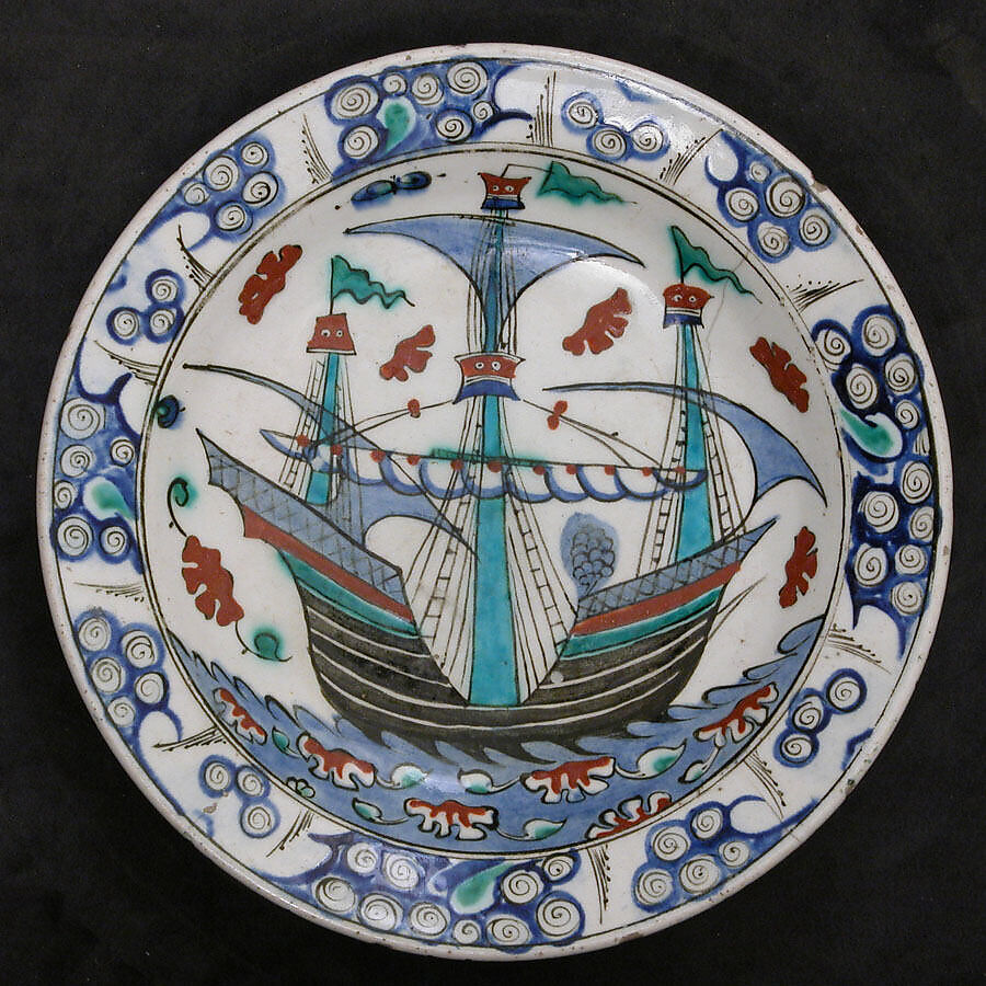 The Ottoman navy had an increasing presence in the Mediterranean in the sixteenth and seventeenth centuries, and it is not surprising that sailing ships became a popular motif in Iznik pottery. Although multiple lateen-rigged ships were the standard on jugs and tankards, on plates the design was normally a single, multi-masted ship, more European than Turkish in appearance, sailing on a schematic sea adorned with curious cloudlike shapes.