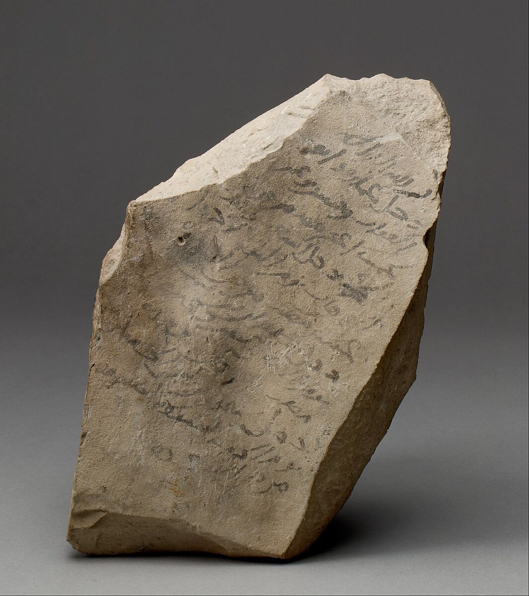 The faded black paint used to inscribe this limestone slab does not permit a proper reading of the text, which was written in a cursive script typical of the early Islamic era. No date is fully legible, thus the inscription cannot be definitively attributed. The only available, though hearsay, information is that the slab was perhaps found at Khirbat al-Mafjar (in present-day Palestine), the site of an Umayyad palace of the first half of the eighth century. The text, beginning with the standard formula "In the name of Allah, the Merciful, the Compassionate," seems to represent nothing more than graffiti, a practice as old as history itself in the area, recording the names of visitors who entered an unnamed building. Here are included three men named Abu al-Ghaffar, Khusraw, and al-Wahhab.