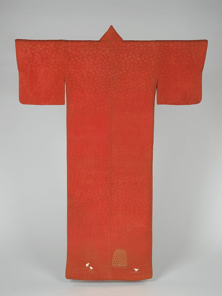 This cheerful robe layers high and low felicitous motifs from the avian realm. The roosters, hens, and chicks present a sweet barnyard vision of domestic bliss, and the woven ground features a classical pattern of pine bough and crane associated with stately, celebratory occasions including weddings and the New Year. The red dye is remarkably well preserved for the age of the garment, and even today, its rich color excites the eye as it sets off the tiny grains of scattered bird feed and gold threaded baskets.