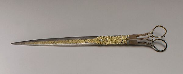 These shears, and a matching pair of tweezers, come from a desk set presented as a gift; in the nineteenth century, sets of calligraphers' tools–scissors, penknife, and makta' (penrest, for cutting the nib)–were commonly ordered by the court for such a purpose. The shears here have hollowed steel blades with intricate damascene inlaid gold ornament. Hollowed shears are said to be used specifically for cutting paper for letters to create an elaborate form of calligraphy. When the cut-out letters are pasted onto a separate sheet of paper, the form is known in Turkish as kat'i. When the page from which the letters have been excised is preserved and placed over a sheet of a differently colored paper, the form is called découpage (from the French meaning "cutting away" or "cutting out"). Shears were also used for cutting evenly-sized sheets from larger pieces of paper. The design of the finger loops, with a scrolling outline, and the floral pattern on the blades are common features of nineteenth-century Turkish shears.