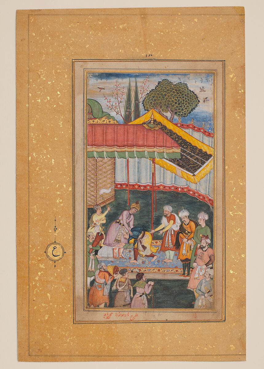 The memoirs of Babur, founder of the Mughal Empire, were translated from the original Turki into Persian under the patronage of Babur’s grandson Akbar, who held a strong interest in the history and literary culture of his empire. In this scene, Babur stands as a visitor bows before him. Courtiers and attendants wear daggers in their sashes that provide a record of courtly fashions and accessories of the time. The fly whisk in the hand of an attendant, the carpet on which the figures stand, and the tent overhead also provide a glimpse into the opulent settings of royal life.
