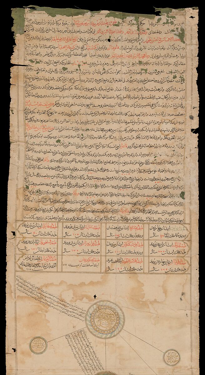 This type of genealogy is based on Persian prototypes first translated into Turkish in the sixteenth century. Starting from the time of Adam, it lists the descendants of biblical figures and their contemporaries in the Eastern world, such as the Sasanian kings of Persia. It continues with Muhammad and the early caliphs through to the twelve major Islamic dynasties, including the Ottomans, descendants of the line of Yafith/Japhet. The names of the patriarchs, prophets, and kings are placed inside circles of various sizes and colors linked by lines. Those containing the names of the more important persons such as the prophets are larger than the others, and are enclosed within ornamental borders. Each sultan is listed with year of death, length of reign, and age at death. The original Ottoman version of this genealogy was dedicated to Süleyman I (r. 1520–66) by its compiler Shafi'i al-Sharif, but the copyist of this version has included information up to the reign of Muhammad IV (r. 1648–87).