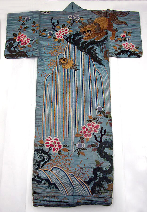 The costumes of the Kabuki theater are known for their dramatic effect. The back of this uchikake, or outer robe, confronts the audience with the shocking spectacle of a lioness with bulging glass eyes pushing a cub off a high ledge. The lioness uses this brutal means to test the endurance of her cubs and will only take care of those who manage to climb back up to the promontory where she stands. On the front of the robe another cub is energetically beginning the ascent. The story, of uncertain source, is associated with a holy mountain of Buddhism, Tientai (Tendai, in Japanese), in China.