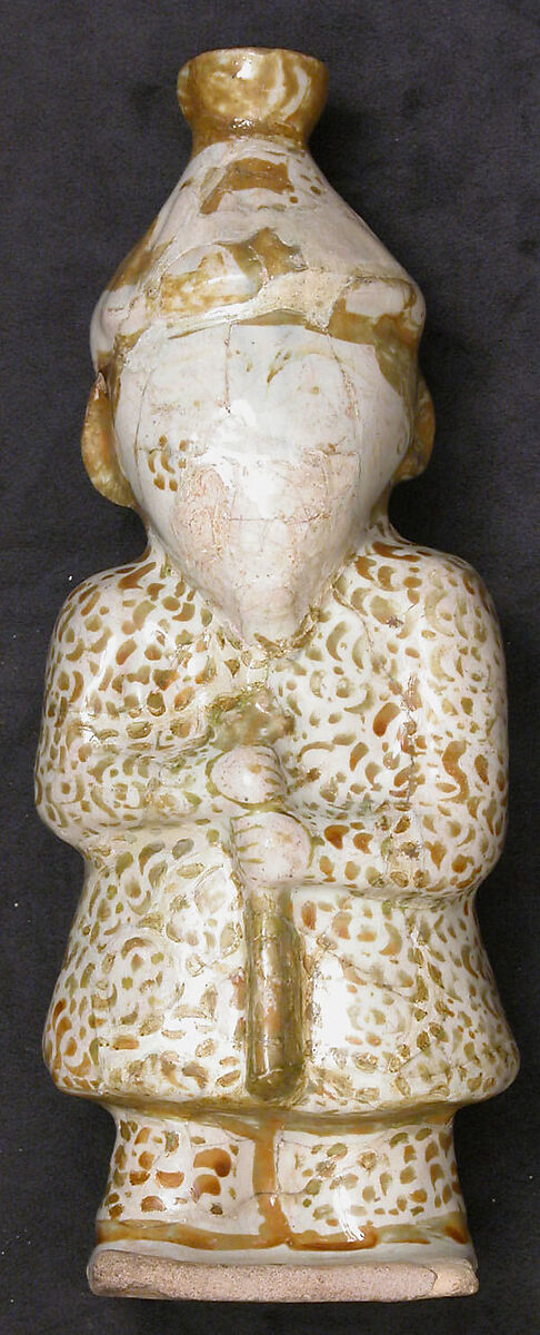 This figurine in the shape of a bearded man with a pointed headdress is made in luster technique. Both this and a similar figural vessel are hollow, suggesting that the pieces were probably used for storing and dispensing water. Hollow vessels such as this one have been attributed to Rayy, Iran.