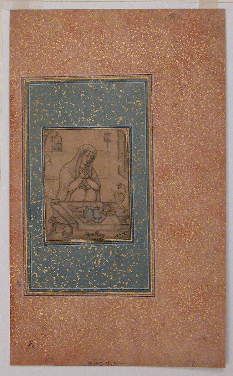 During Akbar’s reign, numerous Christian subjects were copied by Indian artists working from the illustrated Bibles, prints, and paintings that were brought to the Mughal court by Jesuit missionaries and European traders. This image of the Madonna and Child is not an exact copy of a European original, since such details as the depiction of the faces, and the addition of the zoomorphic ewer, show Indian influences.