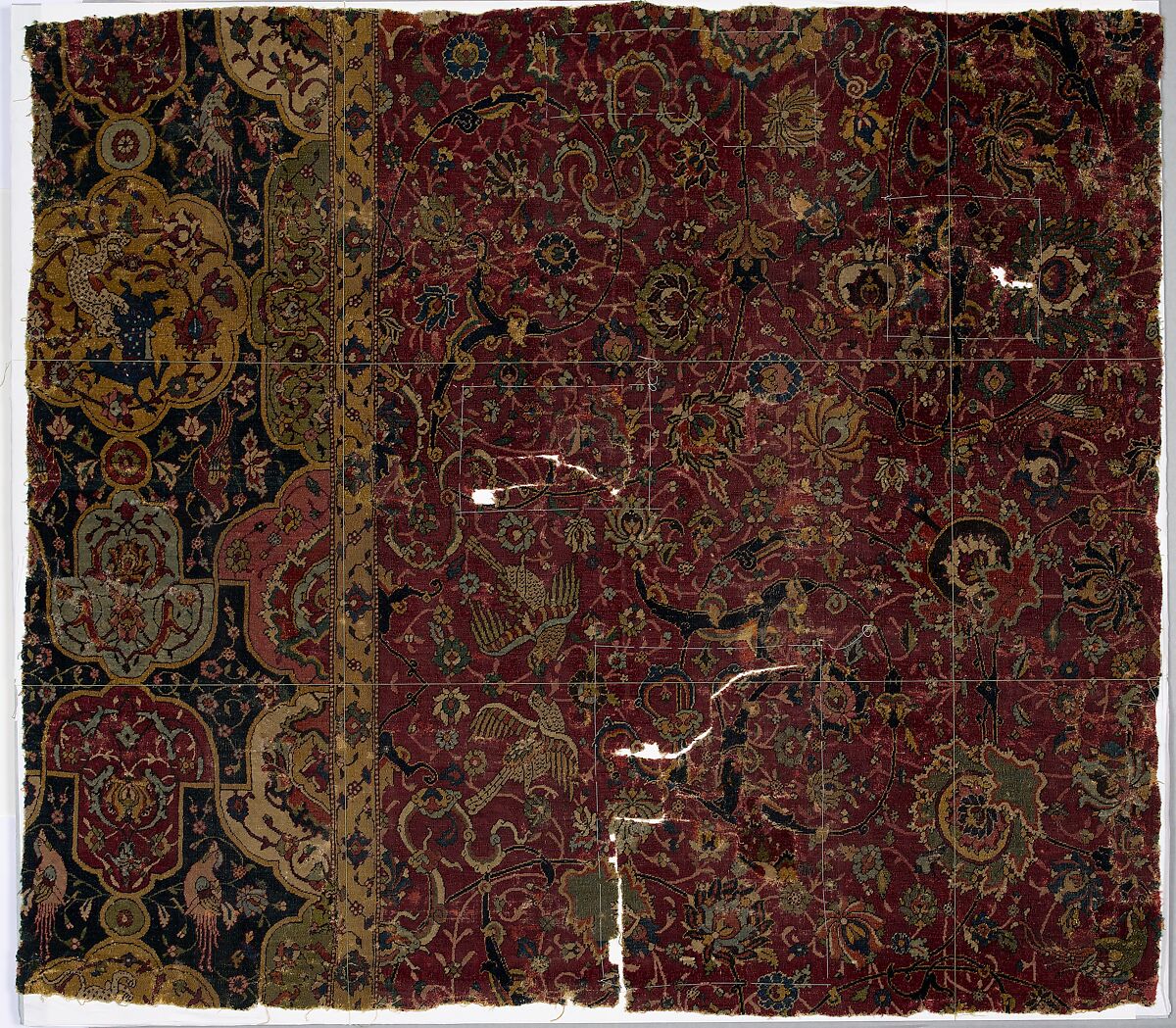 This carpet bears flowers on winding stems, birds, and Chinese cloud bands in a dense arrangement covering the entirety of its deep red ground. Similar imagery appears on works executed in other media, including in painting and bookbinding, from sixteenth century Iran, where it references the role of hunting and gardens in the lives of Safavid elite. Although only a fragment of this carpet remains, polylobed cartouches along its border further reflect this theme.