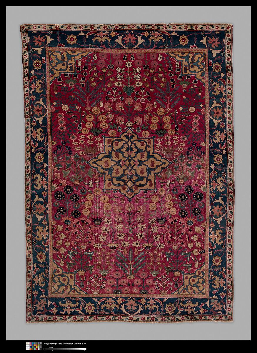 This carpet overflows with naturalistically rendered flowers and plants, organized around one central medallion and four quarter- medallions in each corner. A similar medallion design can be seen on many decorative leather book covers from the same period, and it is likely that the manuscript design was incorporated into the visual repertoire of Safavid weavers. Artists working in the court atelier produced drawings and designs for artisans working in a variety of different media. The designs and trends generated by the court were then adopted by commercial workshops that created high-quality carpets like this one.