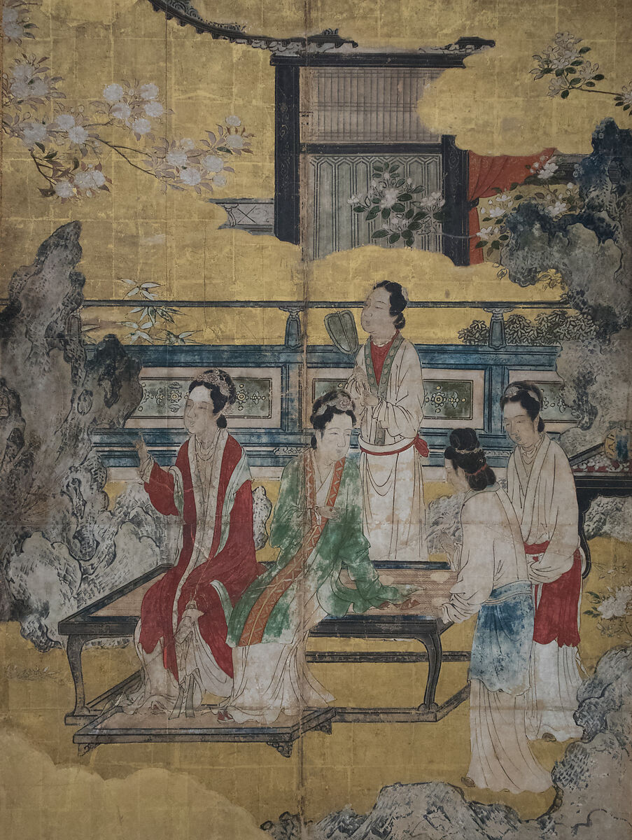 The meticulous brushwork of the draperies and the solid texture of the rock indicate a Kano painter of the Momoyama period, one who might have worked closely with Mitsunobu, the eldest son of the great master Kano Eitoku. Formerly the two left panels of an eight-panel screen, they were remounted as a hanging scroll, since the two panels were the works of another artist.