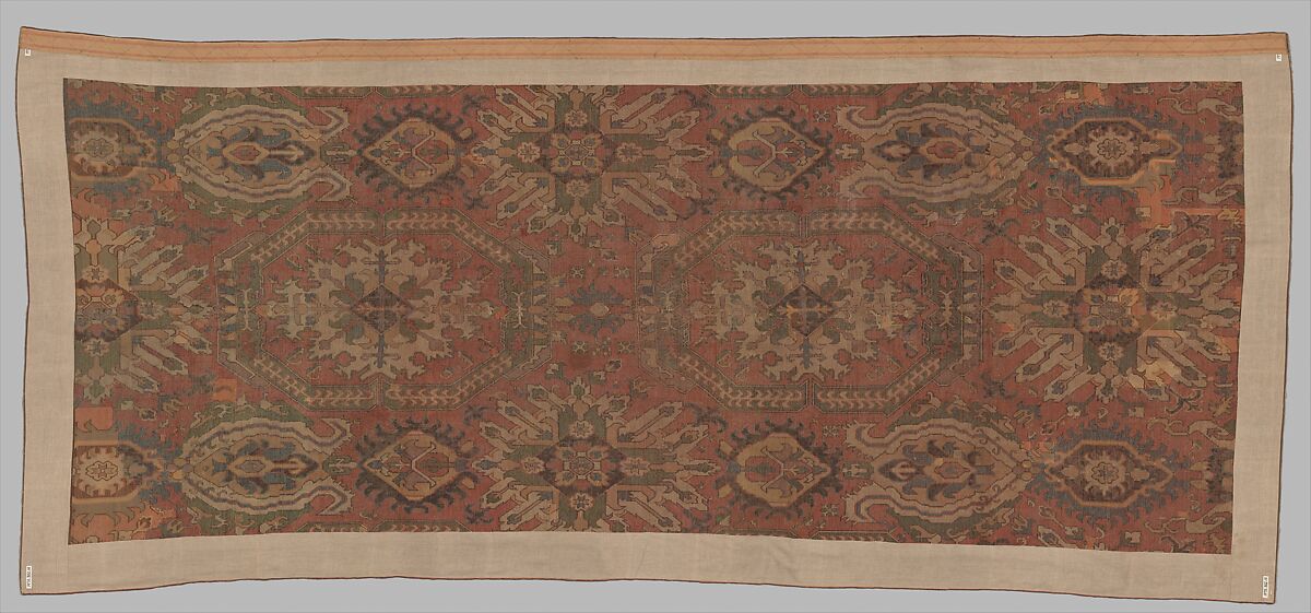 This carpet is representative of the Caucasian weaving tradition with its geometricized motifs and overall design, red ground and other warm colors. The field is composed of repeating large-scale medallion-motifs formed with stylized palmettes, lotus and other flowers, combined with polygonal or star-like patterns. Stylized cypress trees on a stand against a white ground are repeated in the narrow border. A few flowers with rounded leaves on the star-like medallions are remnants of Persian influence and soften the geometrized composition. This powerful design is especially striking on a carpet of this large size and was preferred by commercial workshops, where such carpets with their low knot-count were produced in large quantities for trade. Rugs from the broad Transcaucasian region are woven in diverse centers representing a multi-ethnic society in which Armenians, Turkic, Kurdish, Persianate and other people lived alongside each other. While this diverse society may complicate the attribution to an exact workshop and its cultural identity, it may help to explain the development of a rich and colorful designs that distinguish these Transcaucasian rugs. Although compositions often echo traditions that developed in large workshops between Iran and Turkey, as well as tribal weaving traditions, such rugs bear distinctive features that are regarded as artistic hallmarks of the vast and diverse Transcaucasian region.