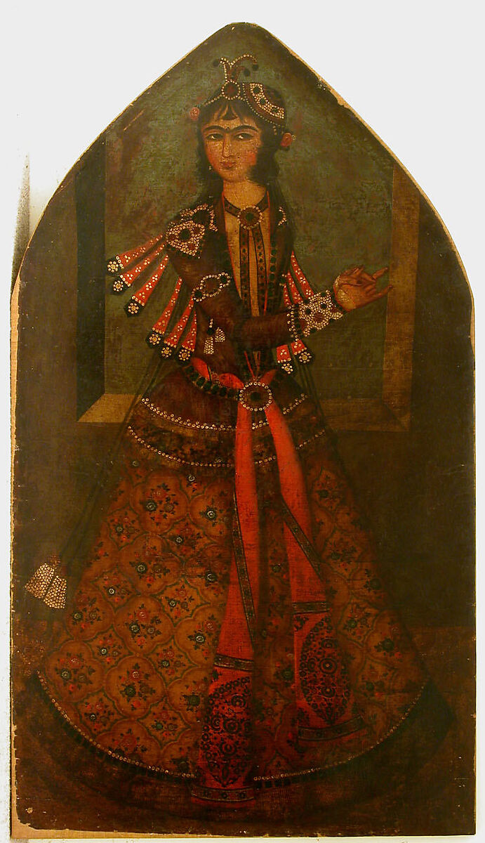The arch shape of this painting suggests it was intended for a niche in an architectural setting, probably a palace or pavilion, where it would have been displayed as part of a larger decorative program along with other portraits of the ruler, princes, and other members of the Qajar court.
