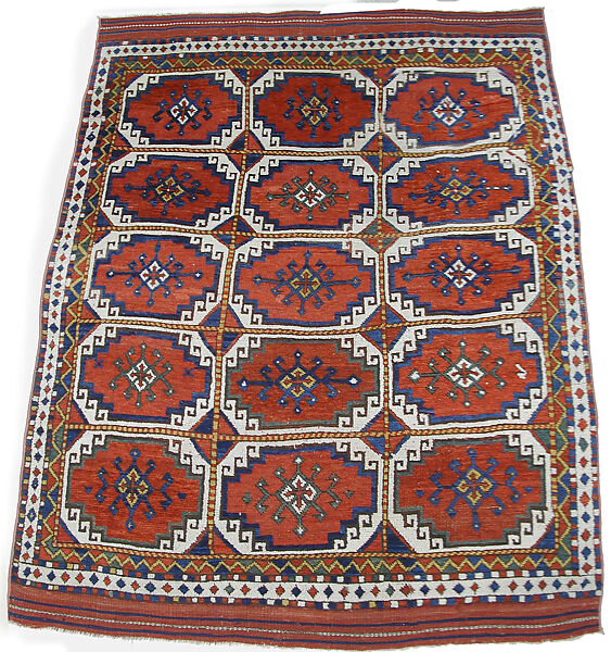 The design of this carpet presents a repeat pattern of octagonal medallions inscribed by a geometric star motif. This type of composition, which has been favored by Turkish carpet weavers since the fifteenth century, derives from the layout of "Holbein" carpets, named after a depiction of a similar work in a famous portrait by the sixteenth–century German painter Hans Holbein the Younger. The bolt geometric design and the contrasting color palette renders this carpet visually impactful.