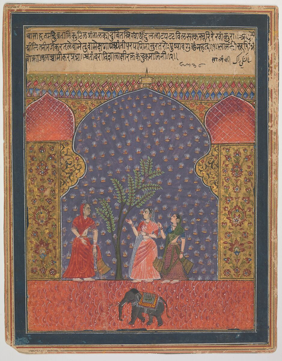 Some of the earliest depictions of musical modes in Indian painting originated in the Deccan, at centers such as Ahmadnagar, where images like this form the visual expression of the mood and sentiment of a classical raga, or musical composition. Conceived of as family groups, the main ragas have wives (raginis) and offspring (ragaputras), which are personified in painting by an established iconography and also often accompanied by written verses. Here, seen through an arched opening, three sari-clad women meet in a flowering garden around a tree, with the raga identified as solanki, in both devanagari and Persian.