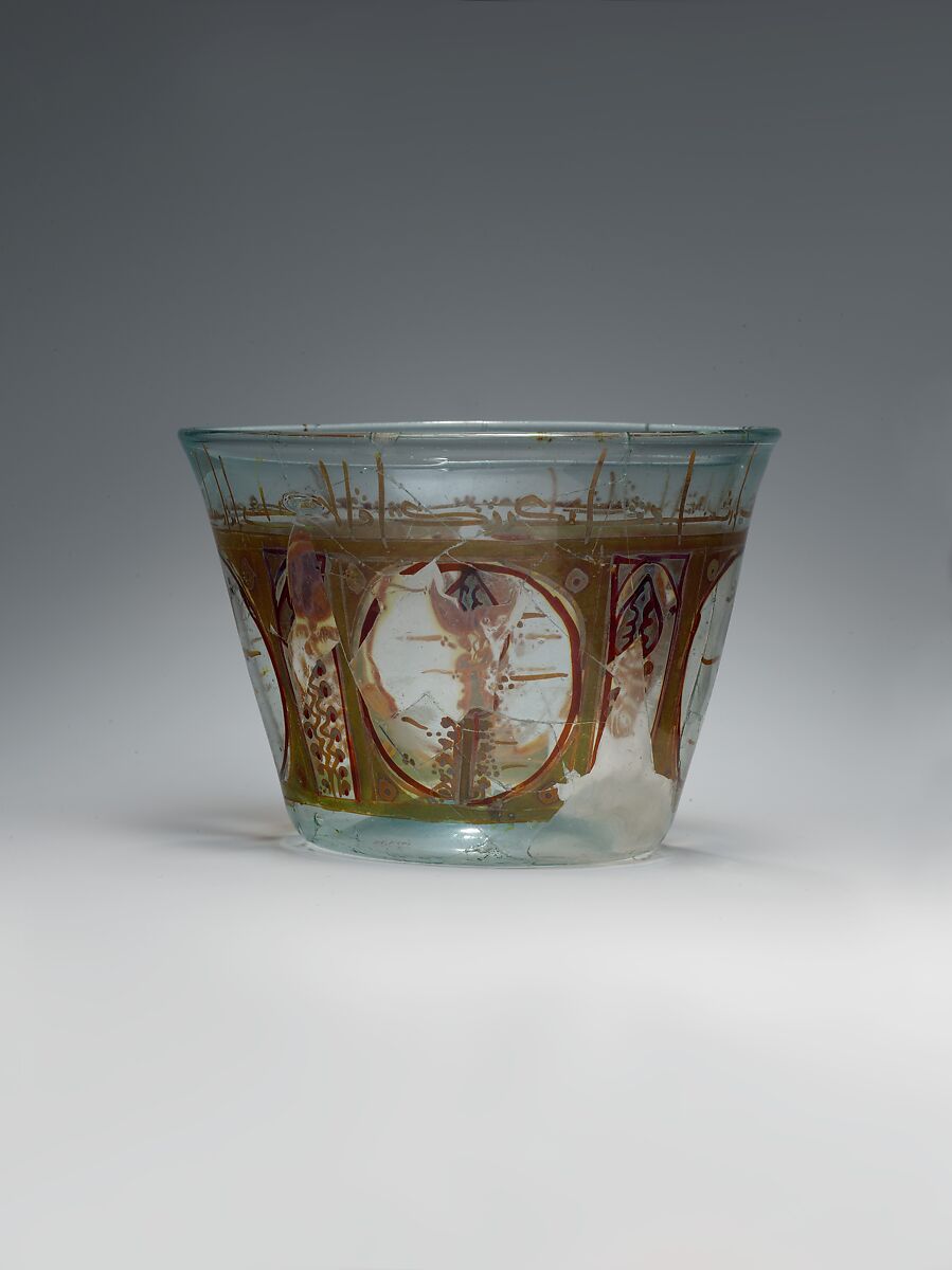 The shape, size, and decoration of this bowl demonstrate an affinity between luster‑painted glass and ceramic lusterware. The division of the vessel walls into panels and the stylized palmette‑tree motifs frequently appear on luster‑painted bowls made in Fatimid Egypt. The Arabic inscription around the rim, in angular kufic script, has not yet been deciphered.