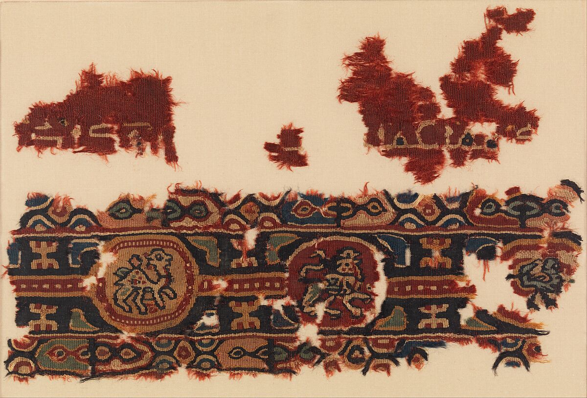 Inscribed textiles are called tiraz, from the Persian word for "embroidery." Many were produced in royal workshops and presented by rulers to honor courtiers and officials at formal ceremonies. Their inscriptions name and bless the current ruler or caliph—a reminder to the recipient that he owed his allegiance to that ruler. This tapestry-woven textile reflects a synthesis of styles common in early Islamic art. The abstract figural motifs in the horizontal band recall Late Antique prototypes. The pattern of alternating roundels and registers was widely used by Sasanian weavers. Above the horizontal band, the remaining fragments include an inscription in kufic script that suggests the textile may have functioned as a sleeve-band.
