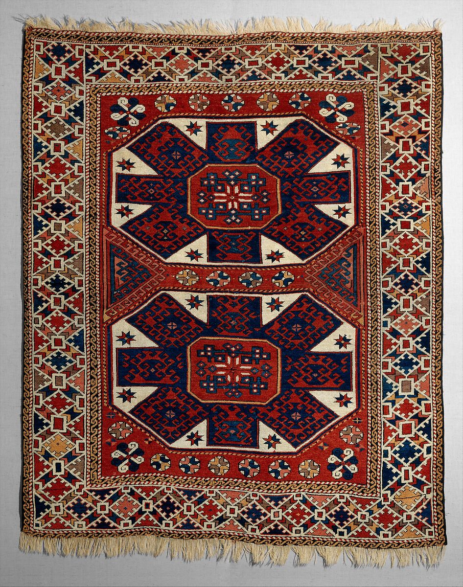 The design of this carpet is dominated by a pair of large octagons inscribed by star motifs radiating from smaller central octogons. This type of composition, which has been favored by Turkish carpet weavers since the fifteenth century, derives from the layout of "Holbein" carpets, named after a depiction of a similar work in a famous portrait by the sixteenth-century German painter Hans Holbein the Younger. The powerful geometric forms impart an unusually strong artistic impact on this work of such modest size.