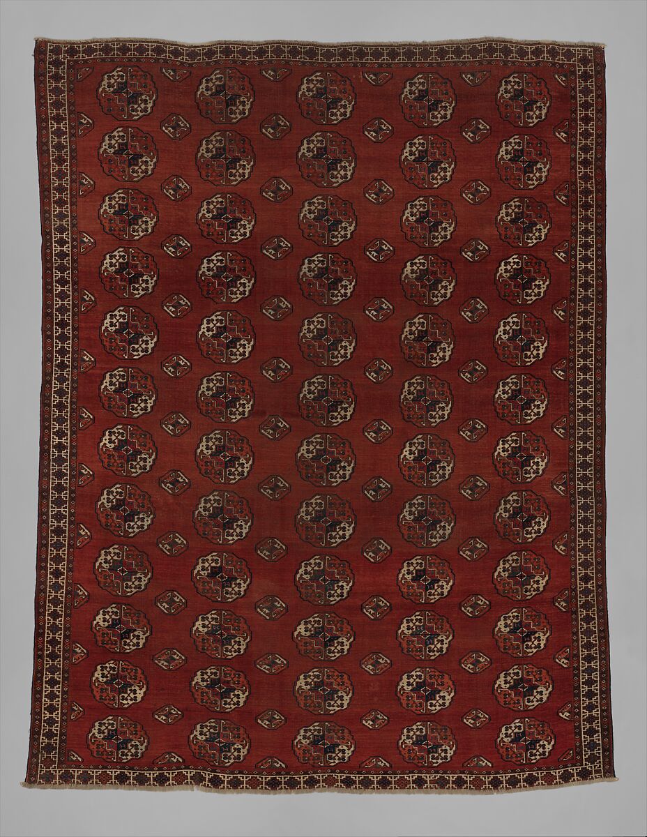 The largest carpets created by Turkmen nomadic weavers, known as "main" carpets, were used on the floors of Turkmen tent dwellings. They usually employed a series of small repeating medallions, known as gul, that varied in form according to the tribe of the weaver. Rare and of unusual beauty, and often incorporating a small amount of magenta silk pile in their designs, Salor main carpets such as this appear to be the archetypes from which other Turkmen tribes derived their own characteristic main carpets.