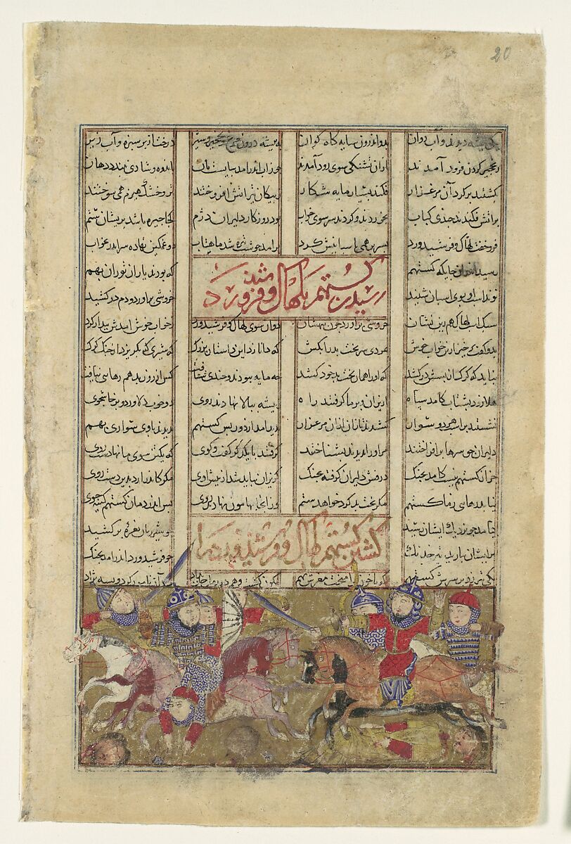 Piran, the wise old commander-in-chief of the Turanians, was slain. He had advised his brothers that his army had been promised quarter in the event of his death but that the Turanian nobles would be in mortal danger. Therefore, the Turanian brothers Lahhak and Farshidvard fled toward Turan, pursued by the Iranian noble Gustaham. Farshidvard was killed by Gustaham's sword and Lahhak frenzied with grief, let loose his arrows. Both cavaliers were wounded, but Gustaham charged and cut off his opponent's head, thus ending a royal line. The artist has depicted a full-fledged battle scene, with all its action and confusion, even though the poem calls for only three combatants.