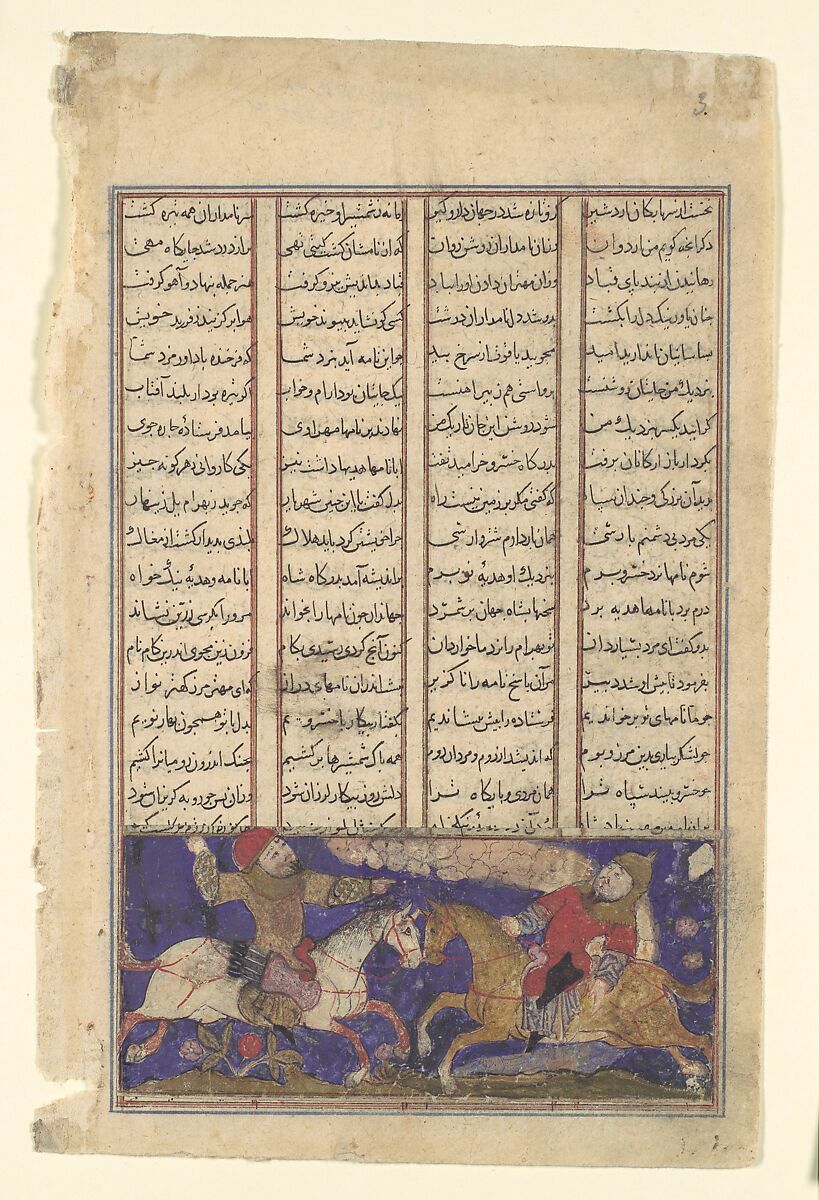 Against the advice of wise men, the general Bahram Chubina went to fight Khusrau Parviz, son of Hurmuzd, and his Ruman army provided by Caesar, in order to gain the throne of Iran. This encounter was the first of many between the two, and only after numerous adventures did the son and heir of the shah finally gain the throne. Text that does not belong has been pasted over the text area on this leaf, leaving only part of one line of the original showing; since the image of two warriors in single combat is generic, it is impossible to be certain if the identification of the scene is accurate. The poses of the warriors indicate that one has just released an arrow and that the other has been struck by it, but the weapons are not visible because of the retouching of the background.