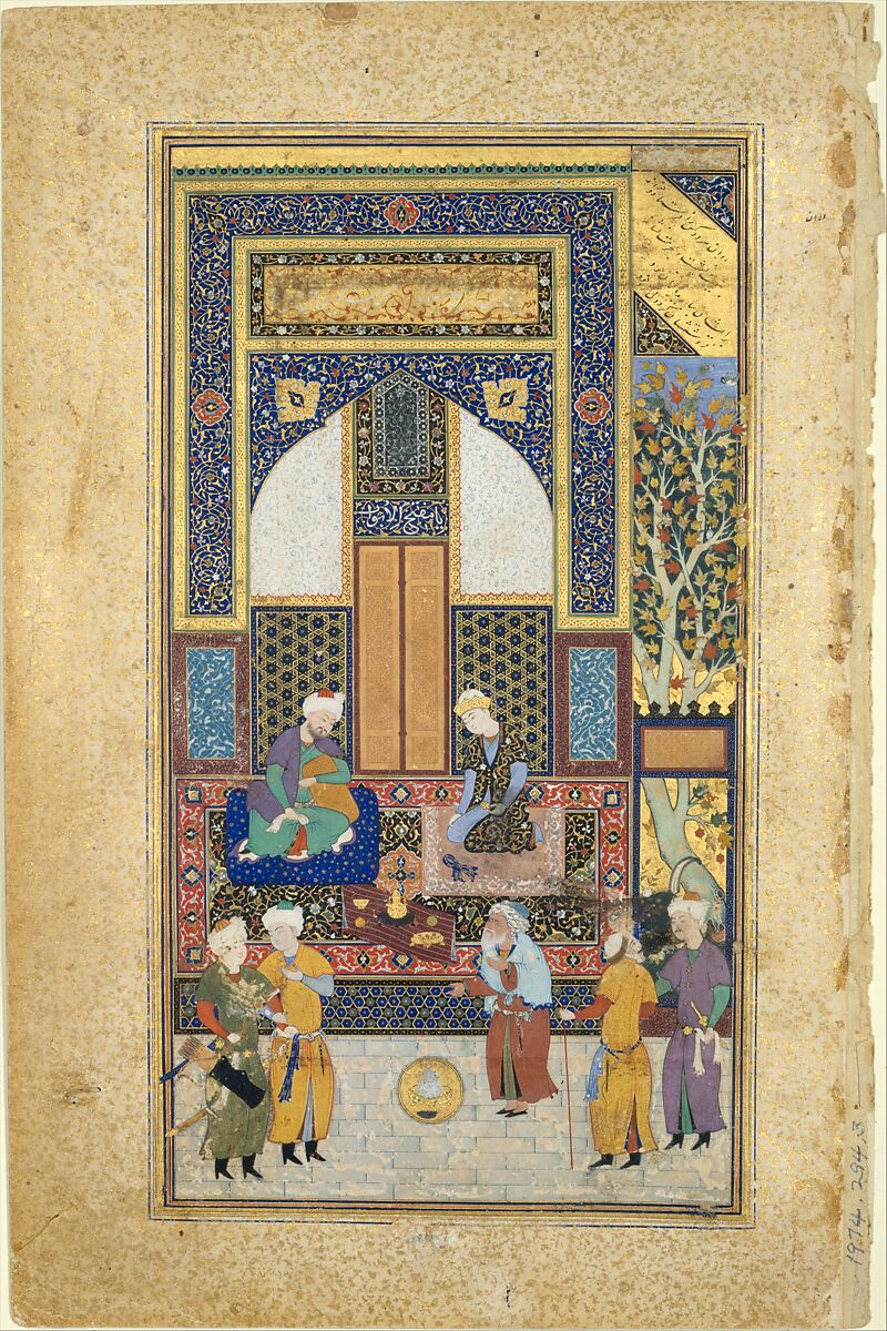 The Bustan of Sa’di, completed in 1257, combines moral advice with illustrative anecdotes. The manuscript to which this painting belongs was likely copied in Herat, but it was illustrated for an Uzbek patron several years later, probably in Bukhara in the 1530s. The Bukharan school of painting, which was influenced by the Herat style, is characterized by a bright palette and the use of a black ground to set off fine arabesque designs. This scene of an interior reception, with its intricately patterned textiles and tiles and fine metal objects and weaponry, provides a glimpse into the types of luxury goods found in the early sixteenth century.