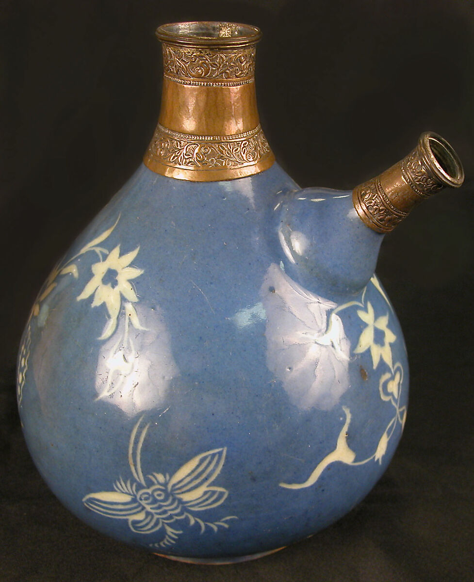 - Medium: Stonepaste; painted in blue and incised under colorless glaze with copper fittings