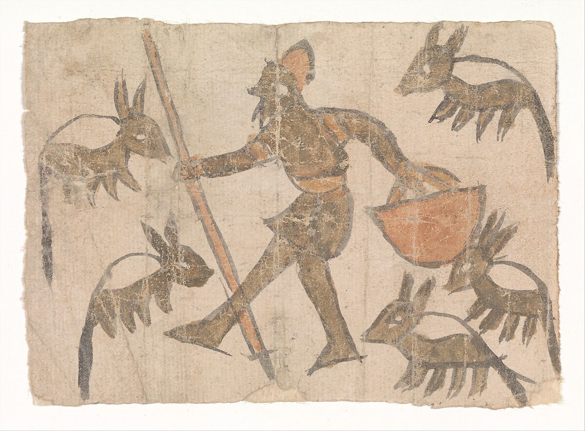 Although the five quadrupeds attended by this bearded herdsman are difficult to identify, they most closely resemble medieval Arab and Persian renderings of boars. This suggests that the scene represents a swine-herd, most likely a Christian, and his flock.