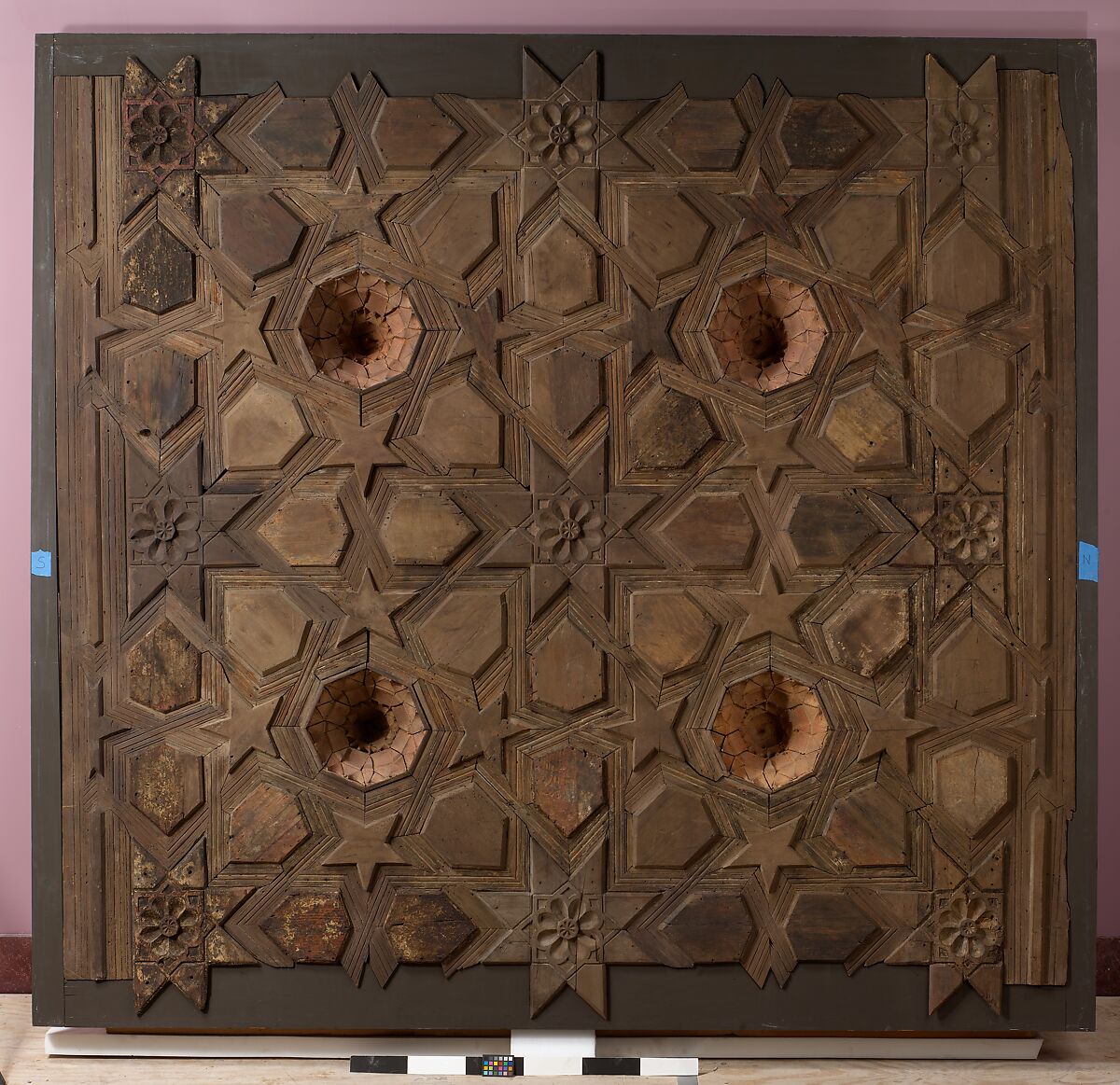 This wooden ceiling panel probably came from a palace or villa in Granada, originally part of a long ceiling covering a patio. The type, referred to in Spanish as artesonado, is well represented among the ceilings still in situ at the Alhambra—for example, the one that covers the porch of the Torre de las Damas. The geometric design, based on a star-and-polygon pattern and articulated by four muqarnas lanterns, would originally have been richly pigmented and highlighted with gilding.