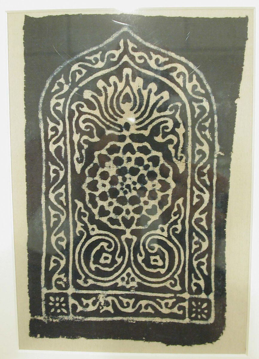 This textile, produced in the fifteenth or sixteenth century under the Gujarat Sultanate, was made with the traditional dyeing technique of kalamkari. A wax resist was applied to this white cotton cloth, which was then dipped into a bath of indigo dye. A lotus-like flower and a sixteen-sided rosette form the design, which resembles that of a jali screen.