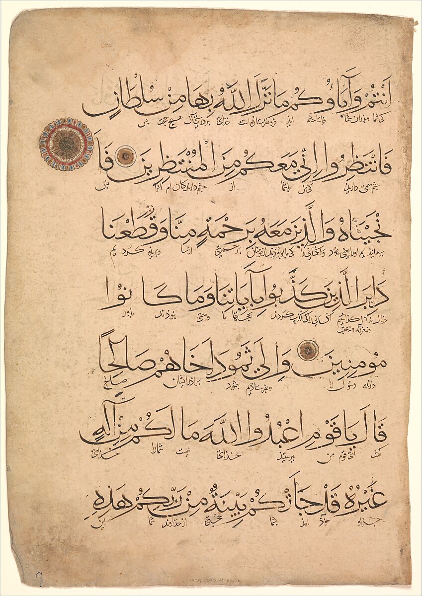 This Qur’an which probably belongs to fourteenth century Iran is written in muhaqqaq script. Each folio has seven lines with interlinear Persian translation in naskhi script. This folio has an ornamental medallion on the margin as a tenth verse marker. Every ayat (verse) ends with a round verse-marker in gold and color. The verses 71-75 are from Surah al-A’raf (chapter 7), which narrates the dialogue between the people of ‘Aad and the Prophet Hud before God’s wrath upon them.