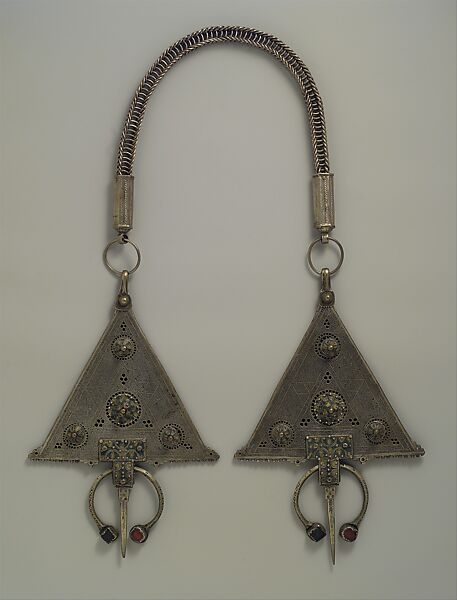 A singular feature of North African Berber costume is the use of the fibula, an ancient article of jewelry that holds capes and other garments in place. Fibulae from the Islamic period consist of two triangular endpieces, which are pinned into the clothing, and a chain that connects them. This piece in silver is an imposing example of a relatively rare type; though there are other examples in the Museum's collection of endpieces with garnets set in enameled bosses, this is much larger than any of these, and the massive double loop-in-loop chain is quite remarkable in effect. The focal areas of the fibula proper are made up of short sections of tubing that have been soldered together. These areas are set off by heavy wire and/or thick strips of sheet on edge. The central bosses–their green, blue, and pale yellow enamel compartments separated by applied twisted wires–are affixed by rivets that run through the center of the triangular elements. Though other classical cultures around the Mediterranean used fibulae, the geometric outline and interior design of this piece are unique to Morocco, and can be found in local textiles as well. In both instances, these designs have talismanic properties and symbolize magic, protection, and good luck.