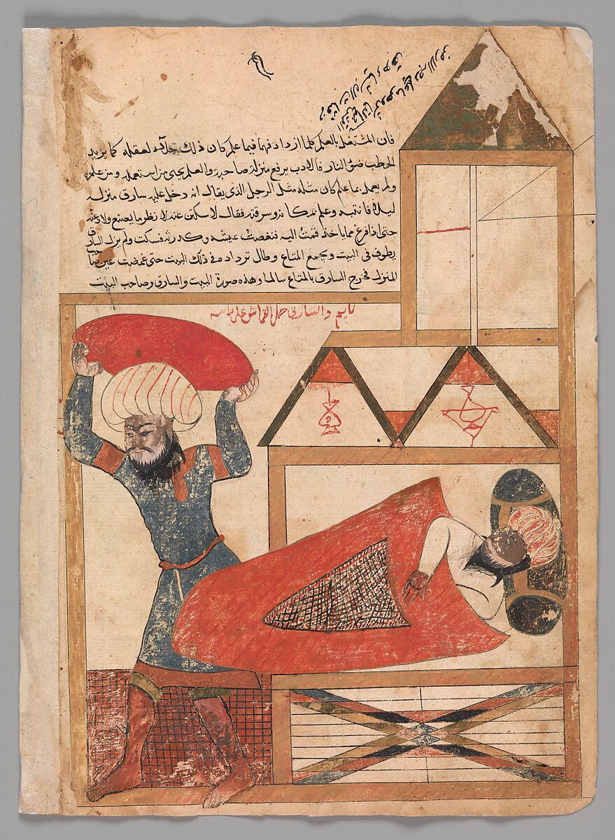 - Title:"The Man who Pretends to be Asleep While the Thief Enters his House Becomes Drowsy and Really Falls Asleep", Folio from a Kalila wa Dimna
