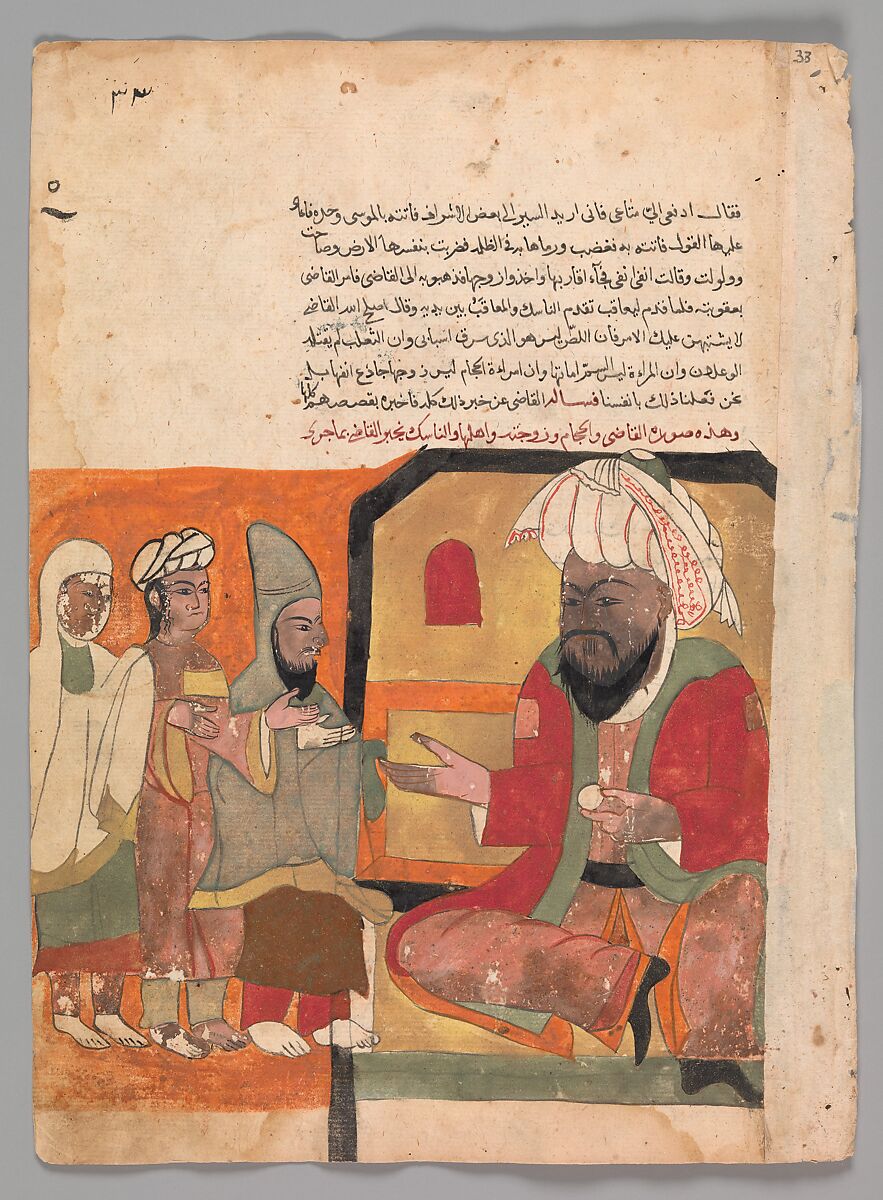 This manuscript contains seventy-eight paintings and many text folios telling the famous tales of the jackals Kalila and Dimna. Based on the book of ancient Indian animal fables, the Panchatantra written by Vidyapati (Bidpai), the stories spread all over the Middle East where they became wildly popular. This manuscript has a strong flavor of Mamluk Egypt in the figure styles and bold drawings, with hints of Ottoman tulips and Safavid turbans. However, the burnt orange palette and darkly-inked lines have led to an attribution to Sultanate Gujarat where it is suggested this manuscript was copied from an Egyptian original. Its life in India is also attested by a Devanagari inscription at the end, although the rest of the Arabic text is written in a strong, left-leaning naskh-like script.