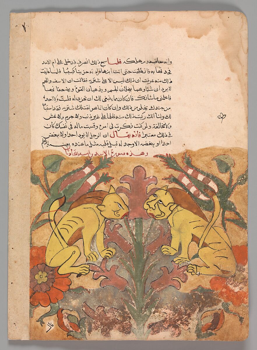 This manuscript contains seventy-eight paintings and many text folios telling the famous tales of the jackals Kalila and Dimna. Based on the book of ancient Indian animal fables, the Panchatantra written by Vidyapati (Bidpai), the stories spread all over the Middle East where they became wildly popular. This manuscript has a strong flavor of Mamluk Egypt in the figure styles and bold drawings, with hints of Ottoman tulips and Safavid turbans. However, the burnt orange palette and darkly-inked lines have led to an attribution to Sultanate Gujarat where it is suggested this manuscript was copied from an Egyptian original. Its life in India is also attested by a Devanagari inscription at the end, although the rest of the Arabic text is written in a strong, left-leaning naskh-like script.
