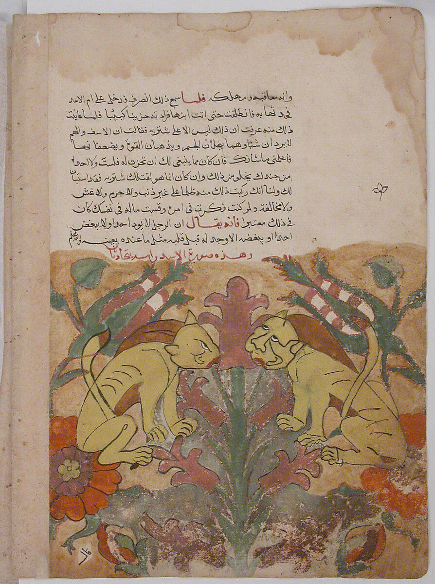This manuscript contains seventy-eight paintings and many text folios telling the famous tales of the jackals Kalila and Dimna. Based on the book of ancient Indian animal fables, the Panchatantra written by Vidyapati (Bidpai), the stories spread all over the Middle East where they became wildly popular. This manuscript has a strong flavor of Mamluk Egypt in the figure styles and bold drawings, with hints of Ottoman tulips and Safavid turbans. However, the burnt orange palette and darkly-inked lines have led to an attribution to Sultanate Gujarat where it is suggested this manuscript was copied from an Egyptian original. Its life in India is also attested by a Devanagari inscription at the end, although the rest of the Arabic text is written in a strong, left-leaning naskh-like script.
