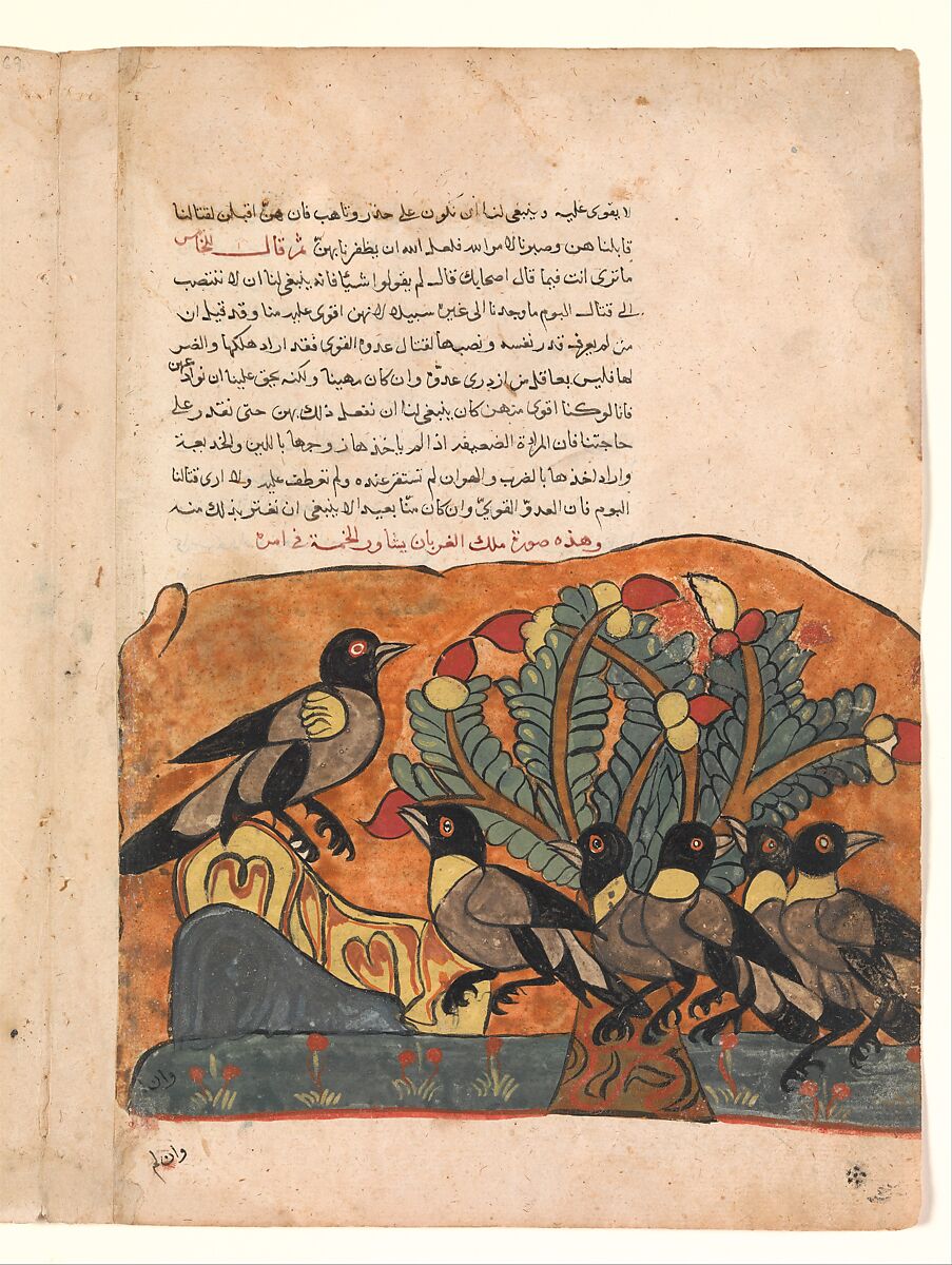 - Title: "The Crow King Consults his Ministers", Folio from a Kalila wa Dimna