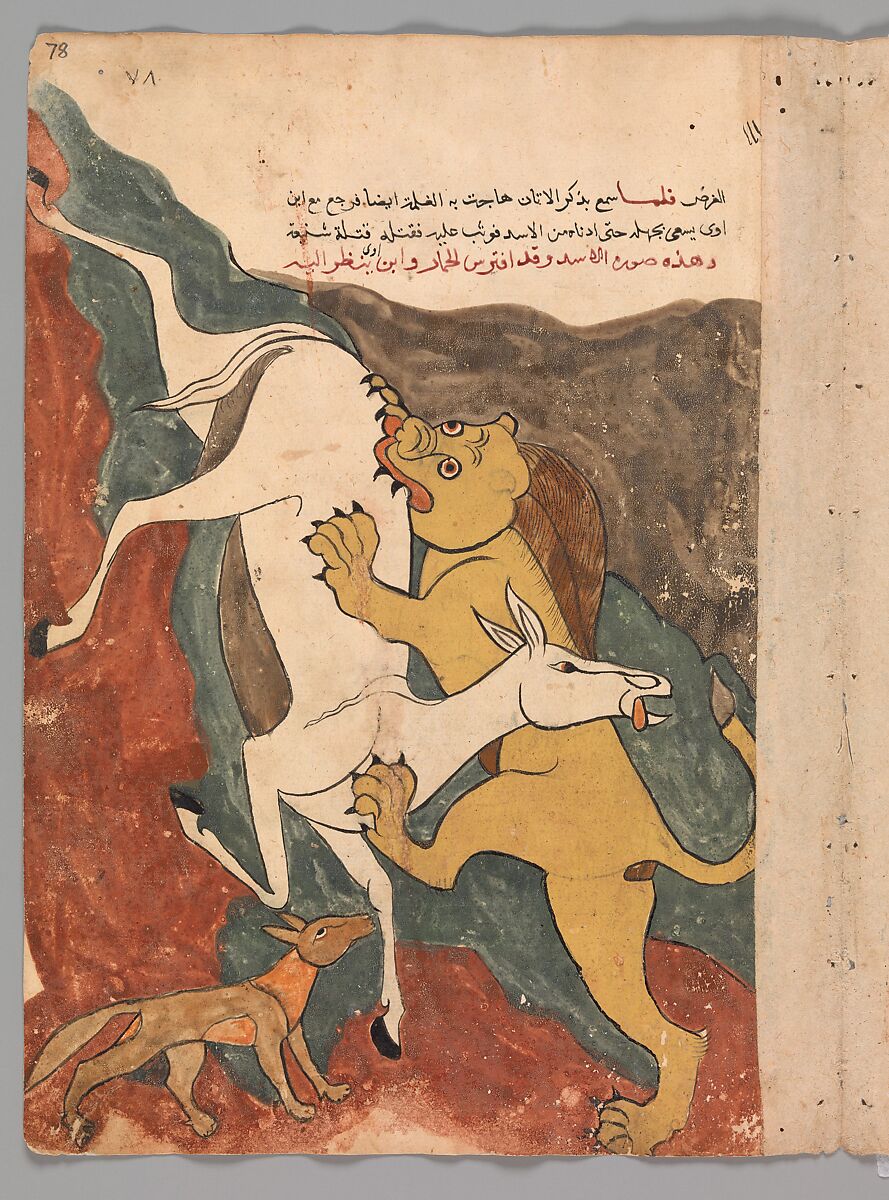- Title: "The Monkey Tells the Story of the Fox Luring the Ass to its Death by the Lion", Folio from a Kalila wa Dimna